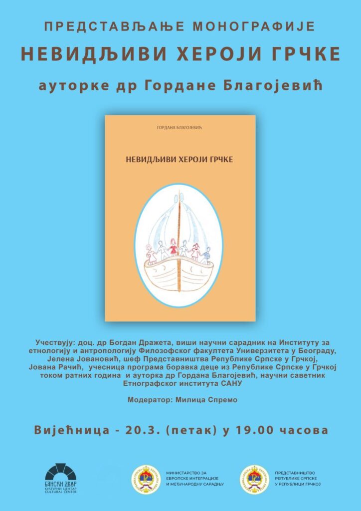 Στη Μπάνια Λούκα θα πραγματοποιηθεί η παρουσίαση της μονογραφίας «Αφανείς Ήρωες της Ελλάδας», της συγγραφέως δρ Γκόρντανα Μπλαγκογιέβιτς, επιστημονικού συνεργάτη του Εθνογραφικού Ινστιτούτου της Σερβικής Ακαδημίας Επιστημών και Τεχνών (SANU).